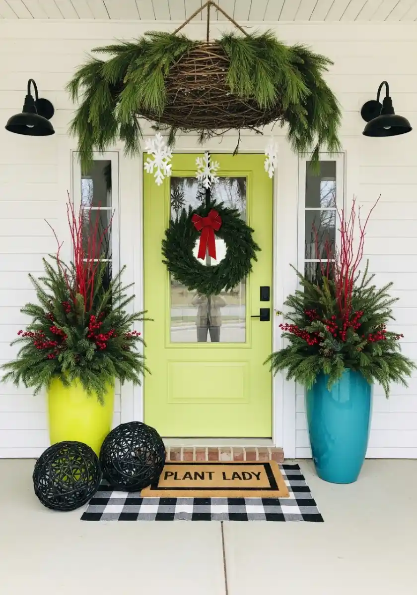 A citron door sets a playful tone and the planters match the confidence. One teal and one chartreuse pot explode with evergreens, red dogwood twigs, and berries. Overhead, a giant grapevine basket stuffed with pine hangs like a natural chandelier, with a few paper snowflakes drifting below.