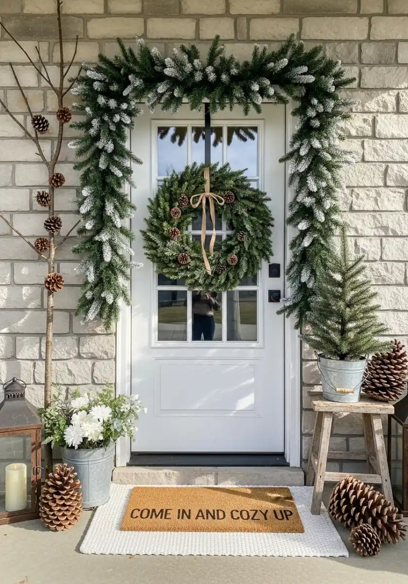 Soft, bright, and a tiny bit glam. A pale door framed with simple greenery and fairy lights gets a fluffy feather wreath with a snowflake in the middle. Pair it with one flocked mini tree in a green pot, a tall WELCOME sign, and a woven twig sphere perched over fresh boxwood. Layered mats widen the footprint visually and keep everything grounded.