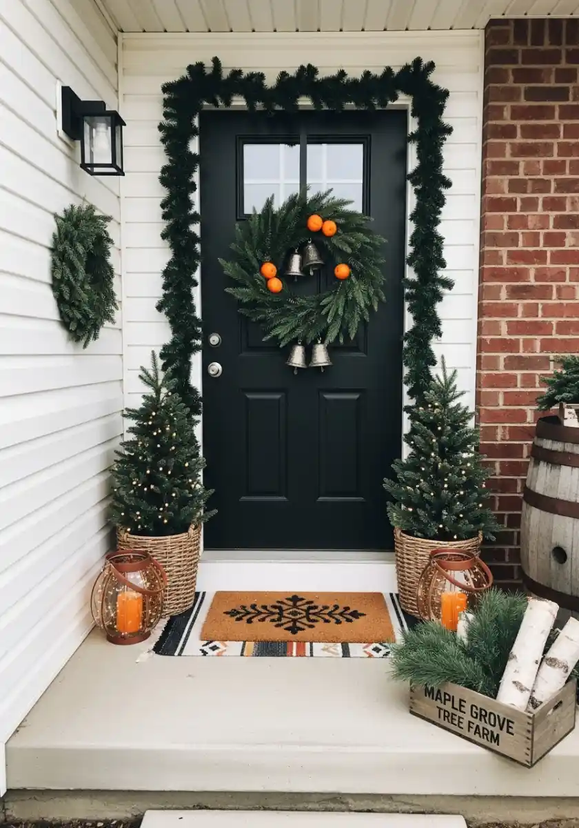 A matte black door wears a lush wreath dotted with fresh oranges and silver bells. On either side, basketed mini trees twinkle over rattan lanterns. A small crate of birch logs and mixed greens sits by layered mats with a snowflake motif. The whole thing feels warm, clean, a tiny bit old-world in the best way.
