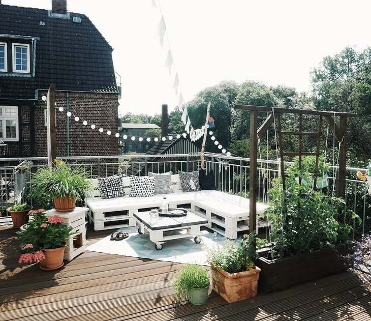 This rooftop patio is bigger than some of the others, but the tricks still work for smaller balconies. White pallet sofas line the corner, creating an L-shaped seating area. A pallet coffee table on wheels sits in front, which is smart because you can move it when you need more floor space. String lights and flags are draped above, giving it a fun party vibe, almost like a mini festival.