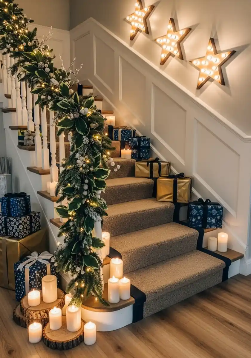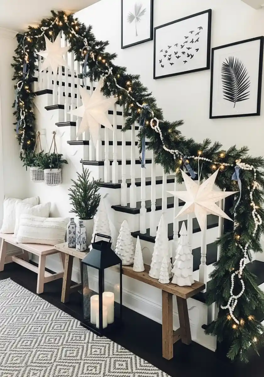 Here’s the clean, calm version of staircase christmas decor that still reads festive. Swag deep green garland in relaxed loops and thread it with twinkle lights and white bead strands. Hang oversized paper stars from the rail so they seem to float. Below, line up white ceramic trees on a rustic bench and add one matte black lantern for contrast.