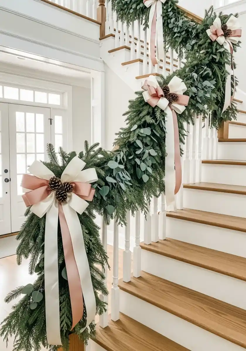 A full yet airy garland drapes down the staircase with layers of cedar and eucalyptus. Mark each post with big ivory and blush bows, finished with pinecone centers. This creates elegant intervals and keeps your eye moving. With white spindles and sunlight, the whole entry feels bright and soft.