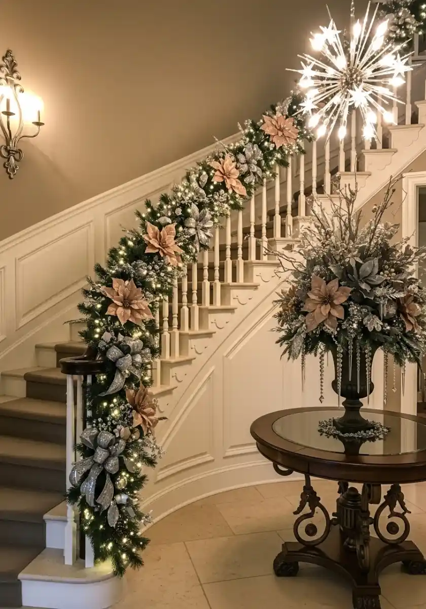 If your house wants drama, feed it. A full garland stuffed with champagne and silver poinsettias, frosted picks, and glitter bows gives that hotel-lobby vibe. The starburst chandelier overhead echoes every metallic accent and throws light across the curve of the staircase. It’s glam but not cold, which is the sweet spot for stairway Christmas decor.