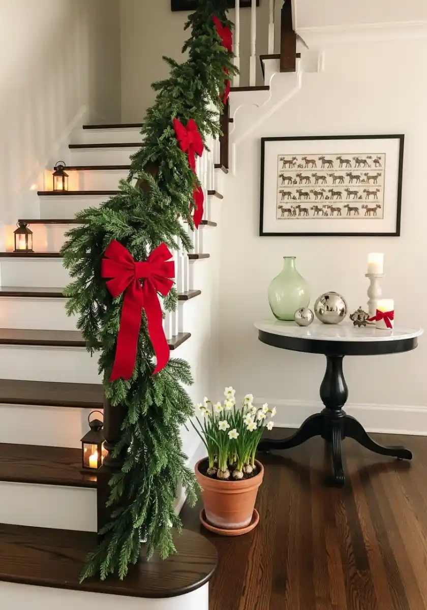 Yes. Keep the swag shallow, add slim ribbon, and focus on a “moment” at the newel. Think one lantern, one mini tree, small but mighty staircase styling.