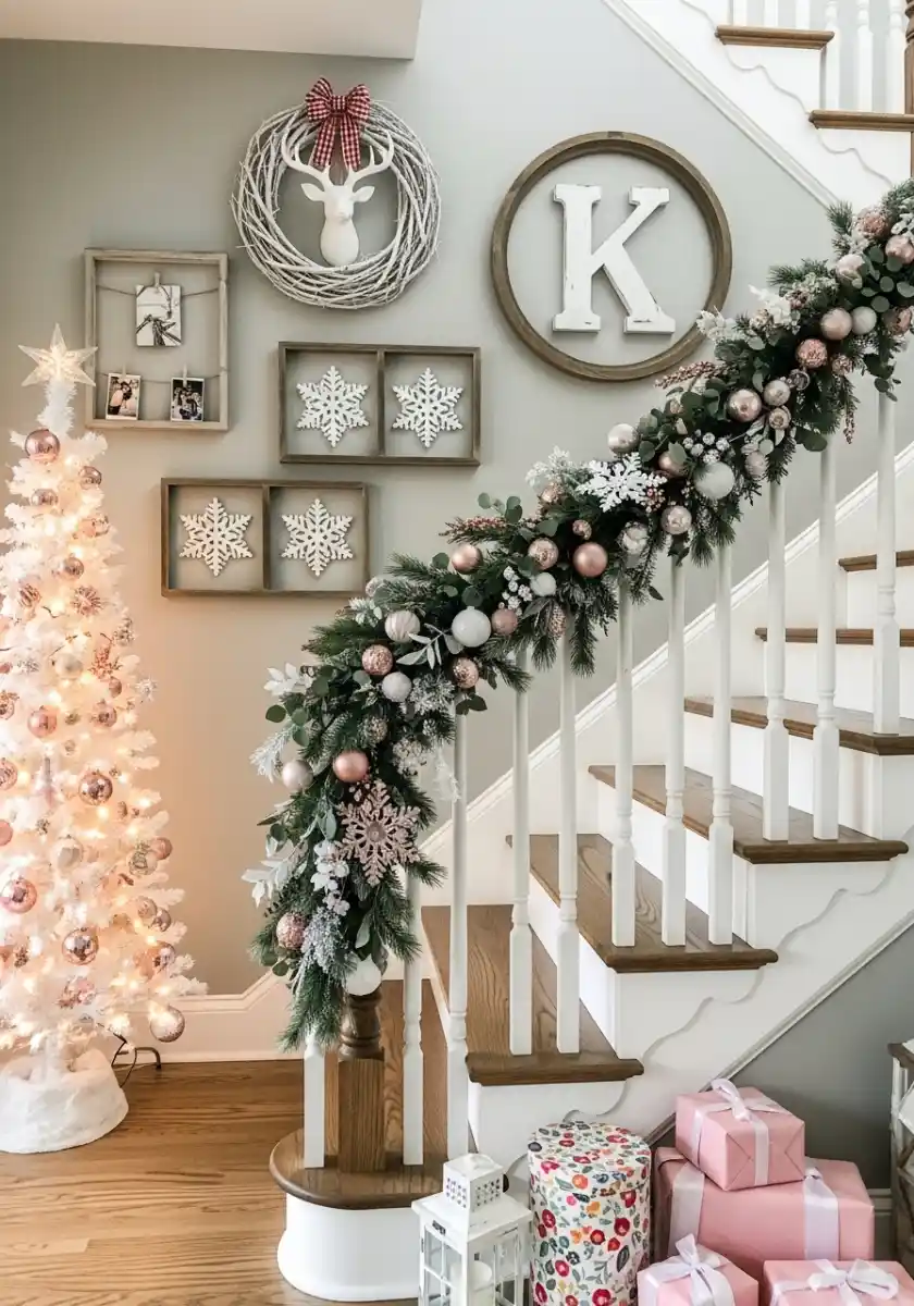Pastel lovers, your time. Build your banister with eucalyptus, frosted sprigs, and blush ornaments, then echo it with a petite white tree decked in rose-gold baubles. On the wall, hang a gallery of wreaths, boxed snowflakes, and an initial monogram to add structure so the softness doesn’t feel too sweet.