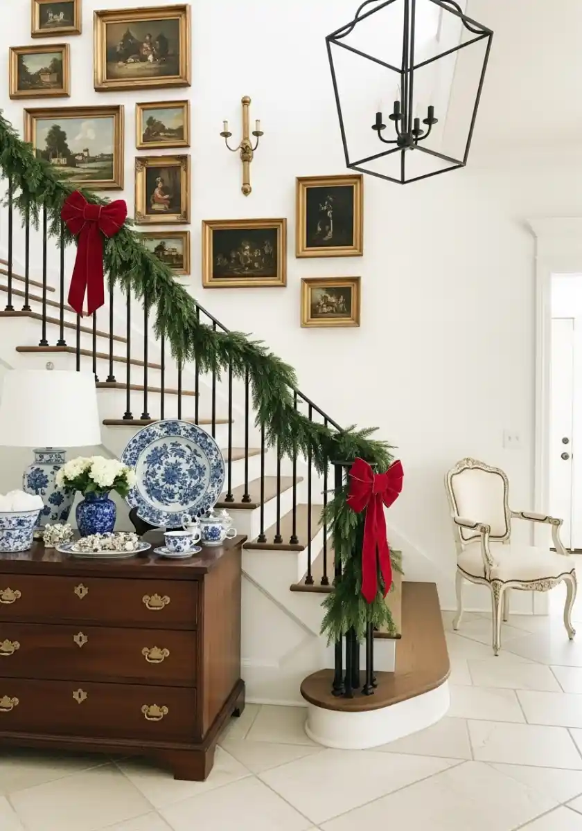 This one blends heritage with fresh greens. Drape a long sweep of cedar garland along iron spindles, then tie in classic red bows. The backdrop is a wall of gold-framed paintings that instantly reads old-world. At the base, a polished chest styled with blue-and-white china and winter florals becomes a little still life.