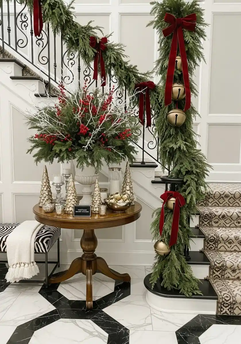 Thick evergreen swags, deep wine velvet ribbons, and oversized brass jingle bells at each newel. Tell me that doesn’t sound like music. Place a round table nearby and build a centerpiece with snowy branches, red berries, and evergreens, then surround it with mercury-glass trees. The marble or patterned floor underneath will make the whole thing gleam.