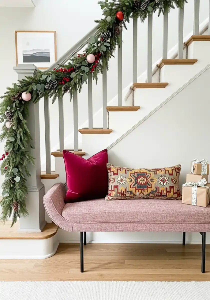 This is pared-back, not plain. Mix eucalyptus and fir in a loose garland, then add pinecones, red berries, and a couple soft blush ornaments. Under the rail, a tailored pink bench with one magenta velvet pillow and a kilim lumbar pops without cluttering the view. Kraft-wrapped presents finish the look.