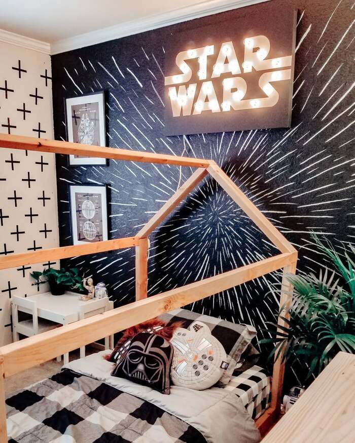 A wood house frame sits in front of a black wall painted with white streaks like hyperspace. It’s joyful and very DIY friendly. Marquee letters spell Star Wars and that gives nightlight energy.