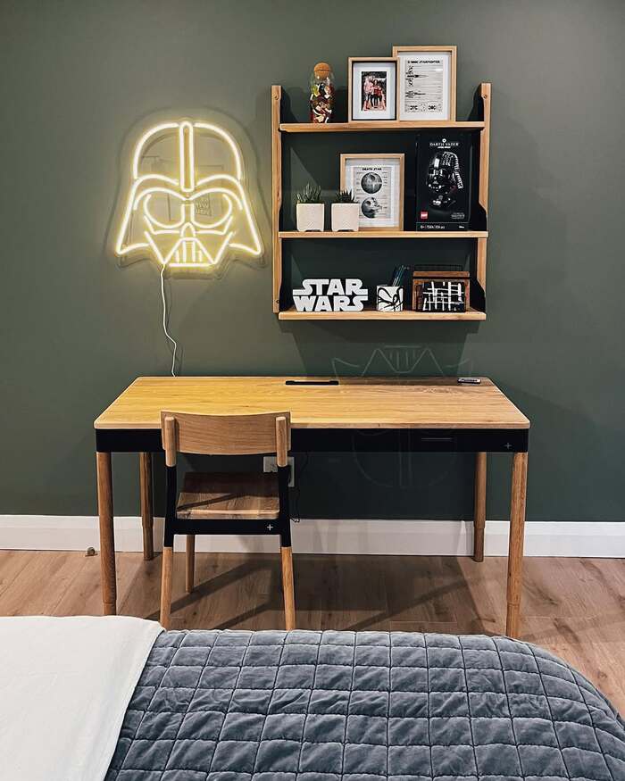This olive green study wall feels calm, then boom, the neon Vader outline snaps the room awake. Style is modern Nordic with warm oak and clean lines.