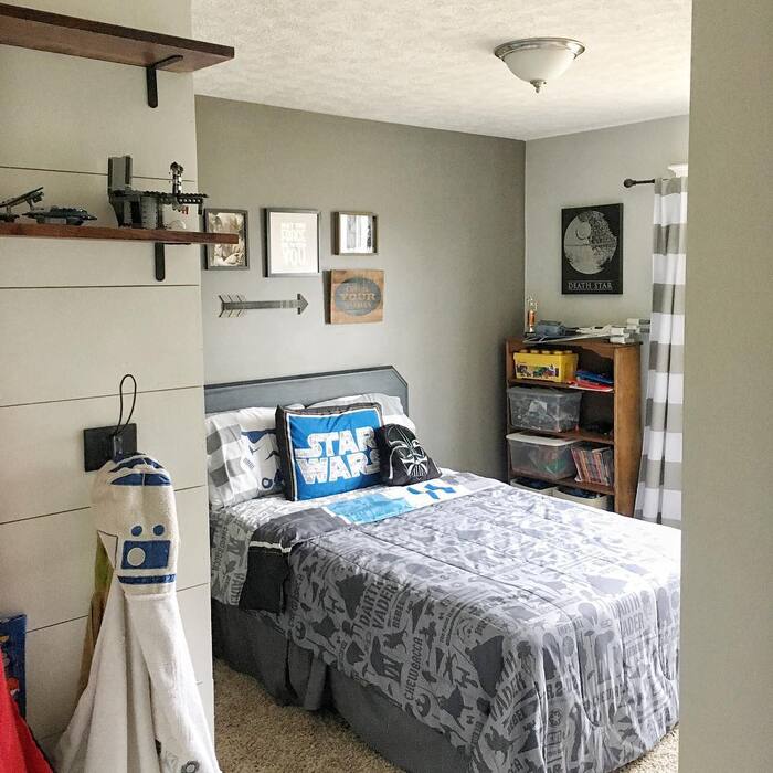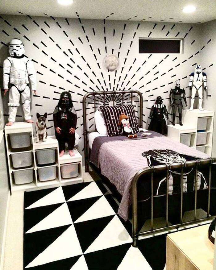 For bedroom ideas Star Wars style, black and white is your budget friend. Paint is cheap, posters are cheaper, and the look stays crisp even with socks on the floor.