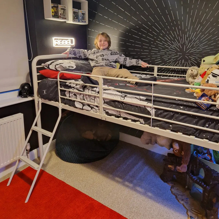 If your room is narrow, push the bed longways to the wall and let the rug run to the door. That runway feeling is perfect for Star Wars room ideas with lots of movement.