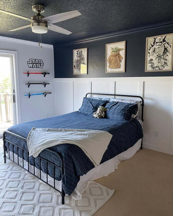 Keep bedding in deep navy grids so the wall stays the hero. For calmer Star Wars bedroom ideas, carry the navy onto the ceiling like this, it feels cocooned in the best way.