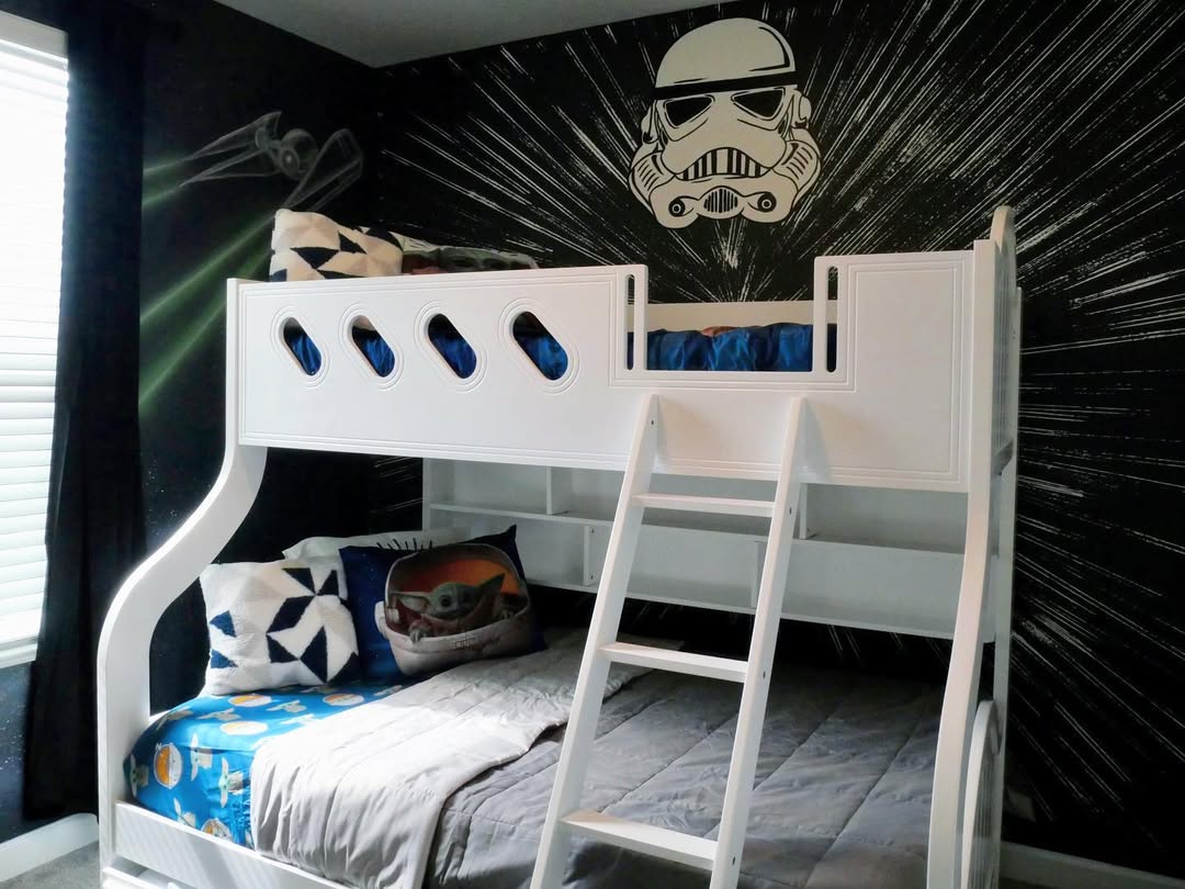 A stormtrooper crest above a starburst wall sells the theme fast. The white bunk with little portholes is adorable and safe. Use gray quilts so the wall stays loud and the bedding stays quiet.
