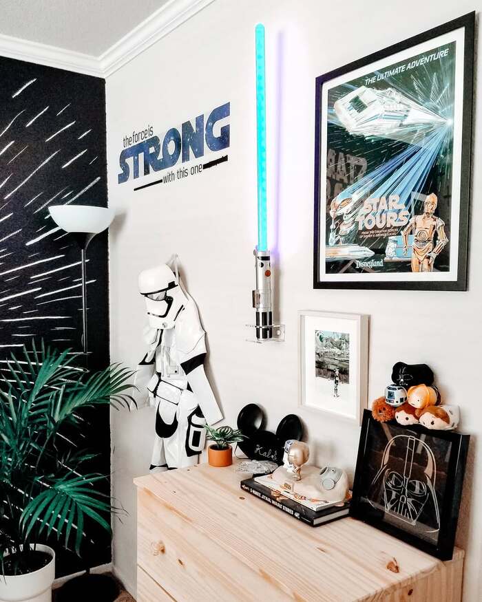 I’m a sucker for a styled dresser. Here the lightsaber sconce is a nightlight and a sculpture. Posters stack vertically, not crowded, which is key. Add a plant to break up all the sharp lines.