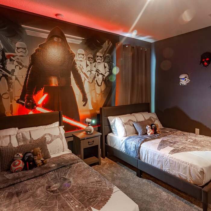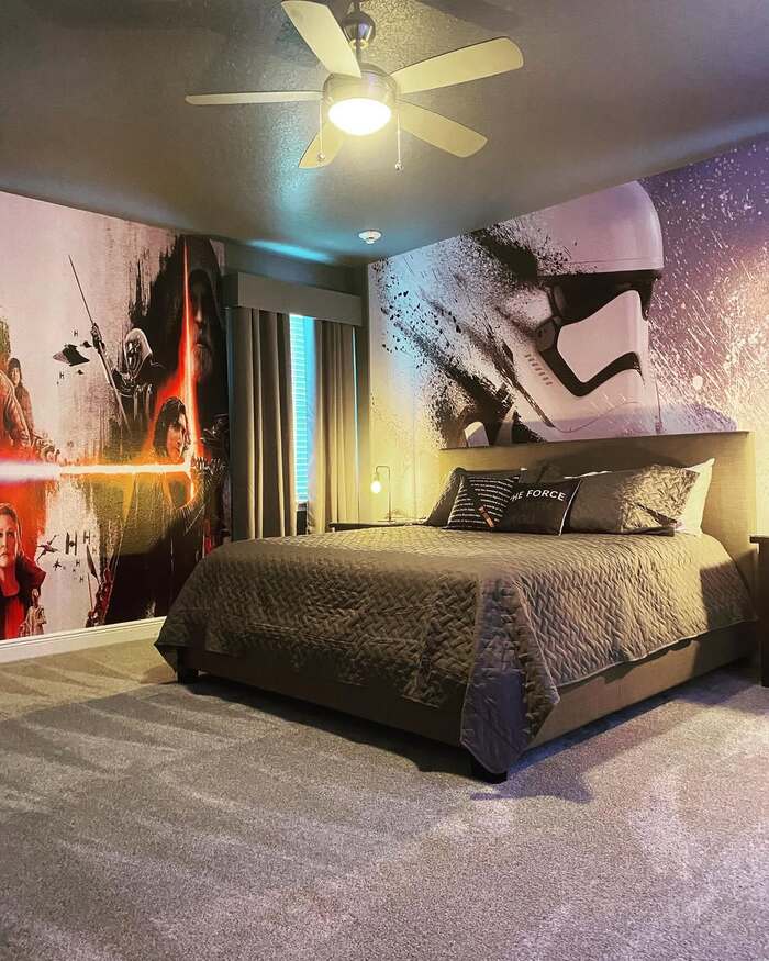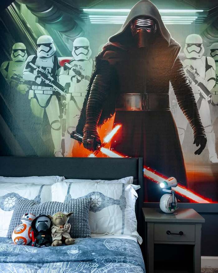 A massive Kylo Ren mural sits right behind the headboard with stormtroopers backing him up. It’s dramatic and a little scary in a good way.