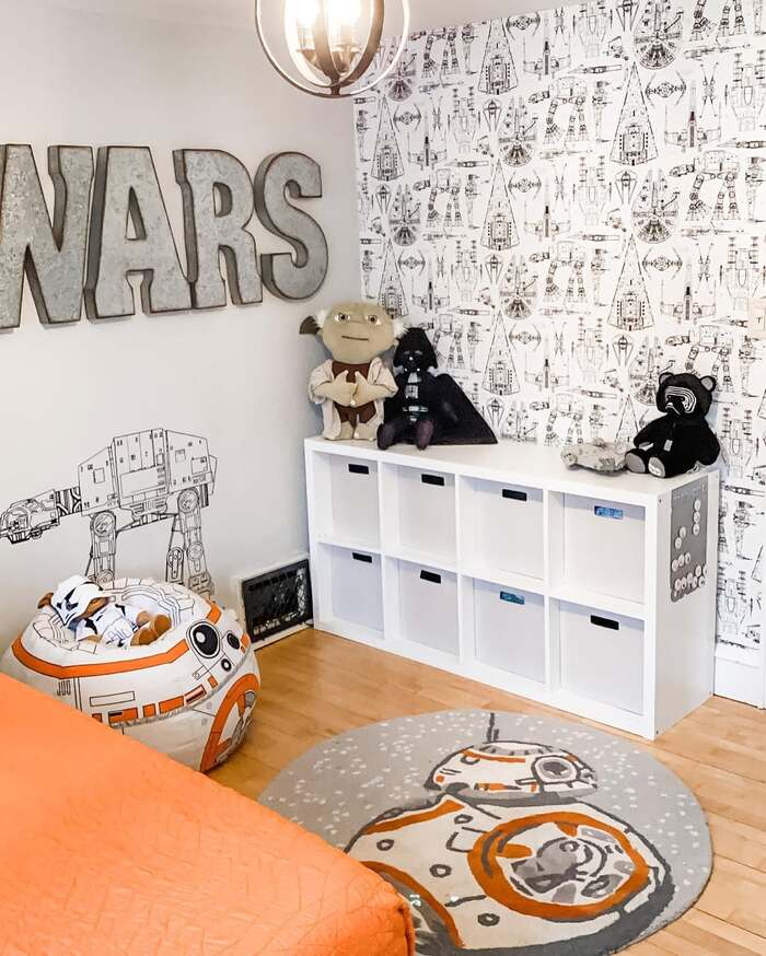 Bright BB-8 bean bag, orange coverlet, and sketchy ship wallpaper. It’s cheerful and easy to clean. Keep storage cubes labeled and low so kids can put stuff back without help.