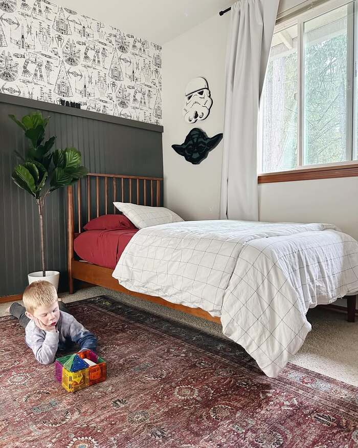 This last one is my secret favorite. A band of blueprint wallpaper up high, dark green paneling, wood bed, and two sculptural masks. Style is cozy mixed with a nod to the saga. The aged rug warms the cool greens. Layout leaves a big floor zone for play, highly practical.