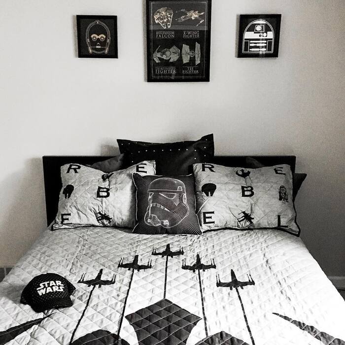 Monochrome bedding with Rebel symbols and three small prints above the bed. It’s graphic and moody in a cool way. I’d swap one pillow to a rich texture like corduroy to warm it up.