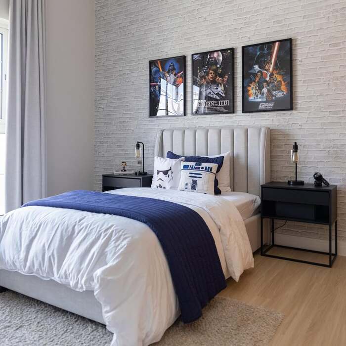 If you’re hunting star wars bedroom ideas for older kids or teens, this mix reads fresh and slightly grown up. Try a red throw at the foot for a small pop and space out wall sabers like a weekday chore chart.