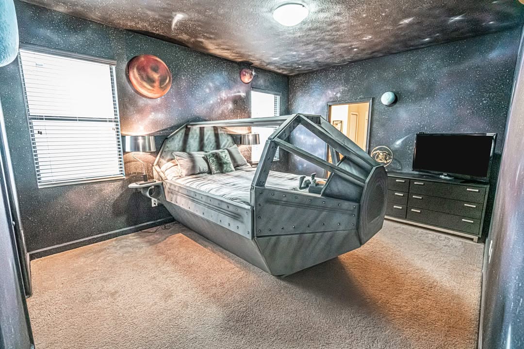 Ok I gasped. The bed looks like a cockpit floating in space. Walls and ceiling are painted like a nebula and the windows help with real daylight. Style is immersive but not cluttered. Keep bedding simple stripes so the shape of the bed shines.
