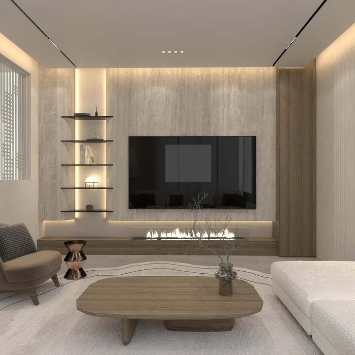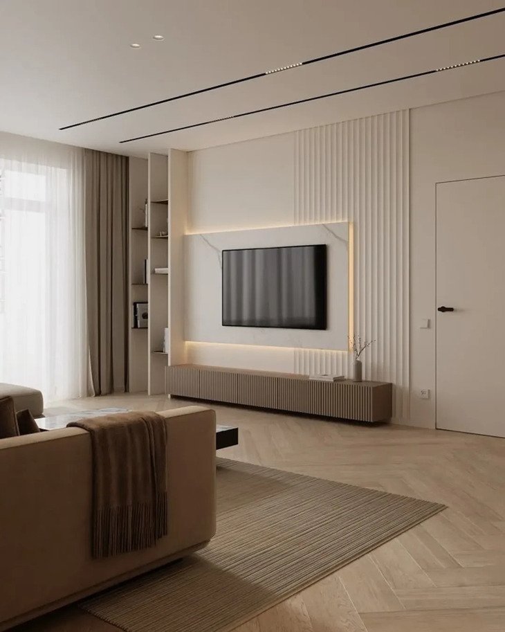 One thing I really love is the lighting groove around the TV. It creates this warm halo that instantly gives a luxury effect. And the soft textures in the furniture keep things from feeling cold.