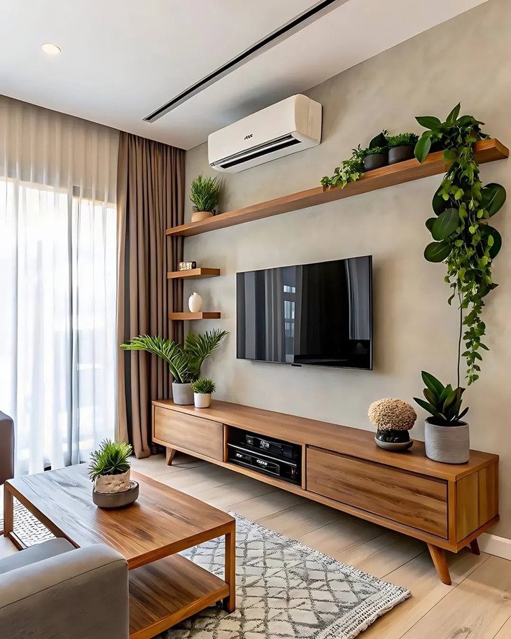 I swear the Instagram algorithm knows I love wooden furniture and indoor plants, because it keeps feeding me setups like this one. The moment I saw it, I said out loud, “Okay, I want this exact room.” Everything in it feels warm, approachable, and casually modern. It’s the type of TV wall decor living room modern luxury idea that doesn’t rely on marble or dramatic lighting but still feels totally elevated.