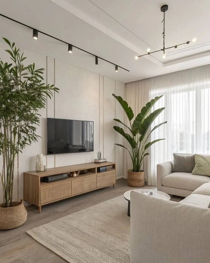 What makes this idea so interesting is how it balances minimalism and warmth. The wall behind the TV is light, uncluttered, and elegant. But the huge potted plants on each side bring life, shadow, and shape into the scene. It’s such a good reminder that luxury doesn’t always come from expensive materials but from how thoughtfully a space is arranged.