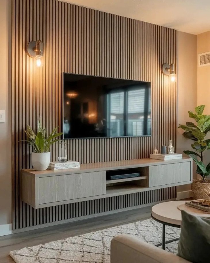 There is something magical about vertical slat walls. They instantly create shadow, depth, rhythm, and warmth without adding clutter. This particular design uses them behind the floating console and TV, which gives the whole wall a structured but inviting look. Add two warm sconces on each side, and suddenly the room feels like the coziest modern hotel suite ever.