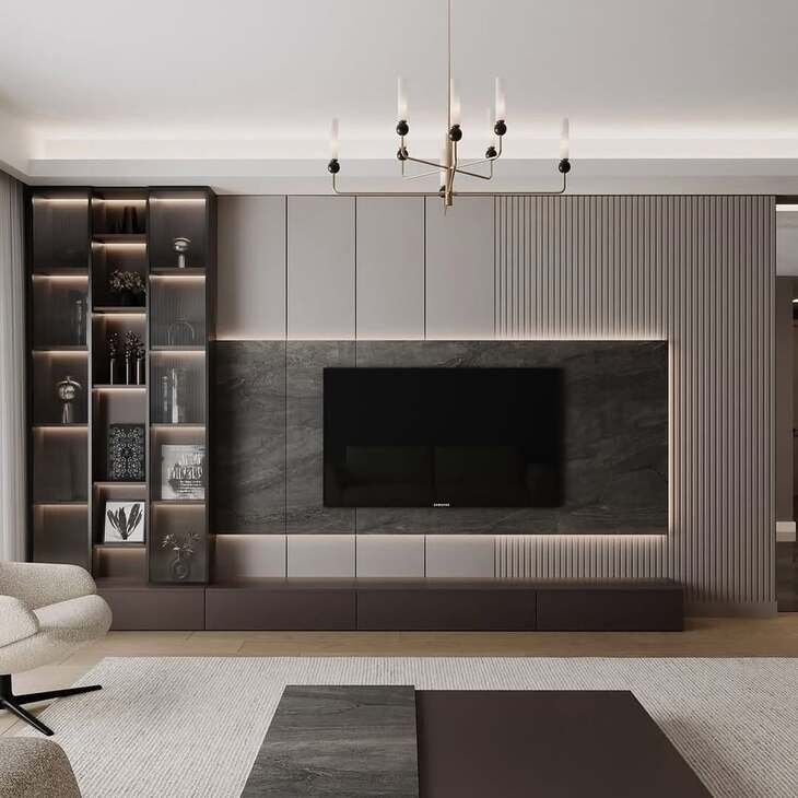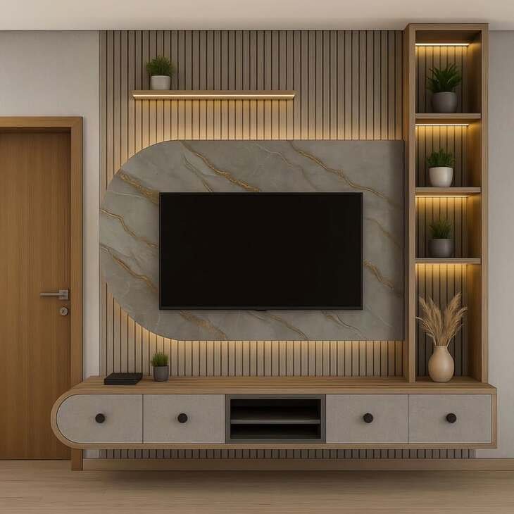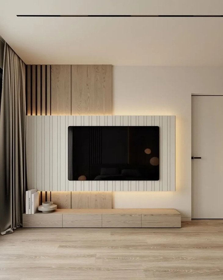 This design is super clean, super minimal, and kind of addictive to look at. It uses a mix of subtle vertical lines, pale wood, and integrated lighting to create a calm modern luxury look. The TV itself almost disappears into the wall because everything is so streamlined. And the asymmetrical layout? Perfection. It makes the wall feel artistic without going overboard.