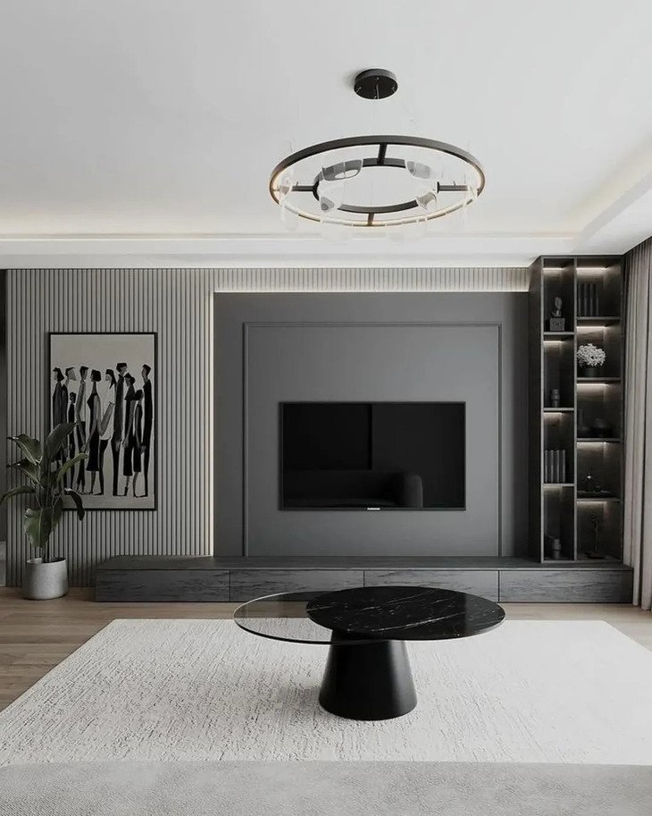 This one belongs in an “effortlessly rich” mood board. The dark charcoal wall, the subtle paneling, the built-in shelving with spotlighting, and the sculptural chandelier all come together to form a modern luxury vibe that feels clean and expensive.