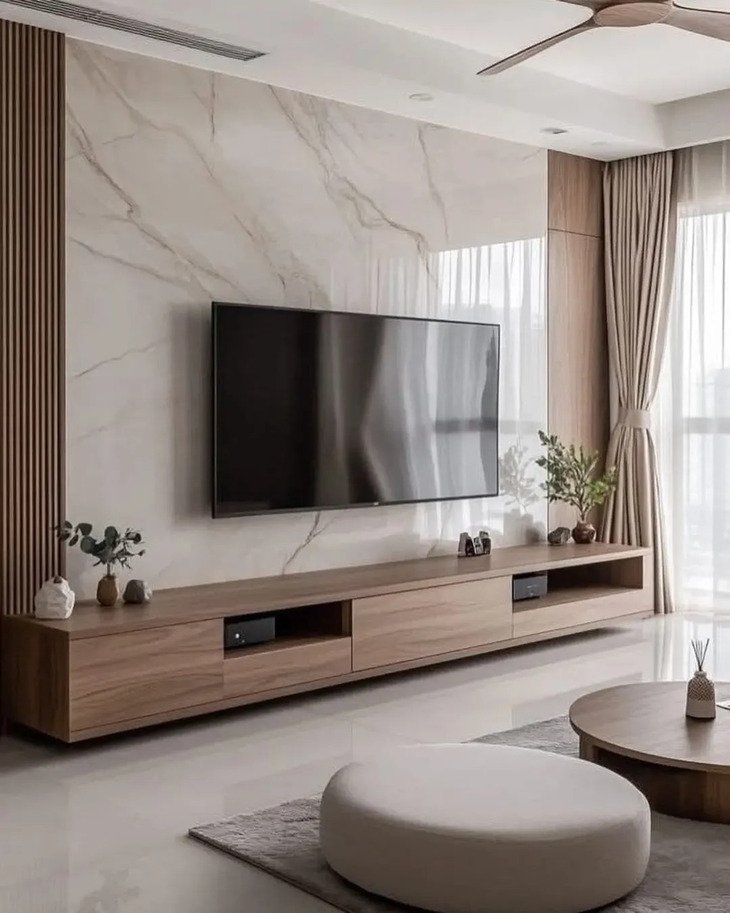 What makes this a strong TV wall decor living room modern luxury choice is how timeless it feels. Marble never goes out of style, and the wood grounding the design keeps it warm. It’s the kind of setup you can have for years without feeling outdated.