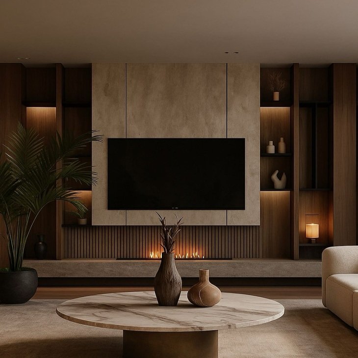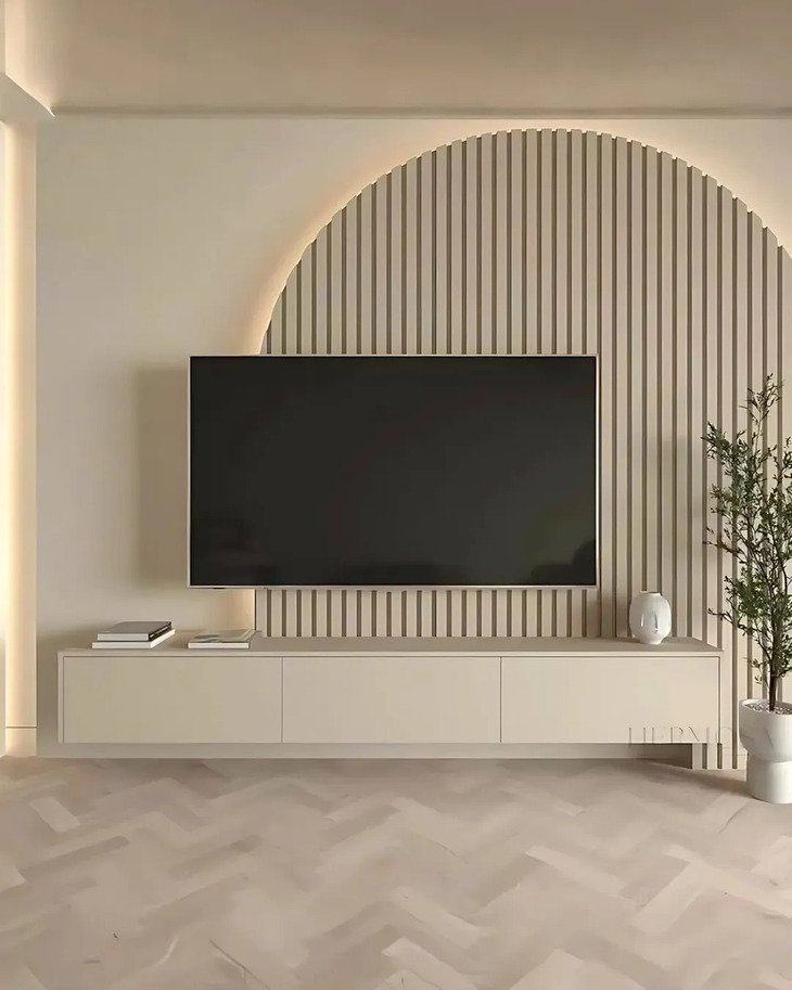 This one stopped me mid-scroll. The half-arch paneling behind the TV is so unique and clever. It instantly sets the tone for the entire room. The vertical slats add depth, while the curved silhouette softens the whole look. The lighting around the arch gives that magical glow that modern luxury interiors love.