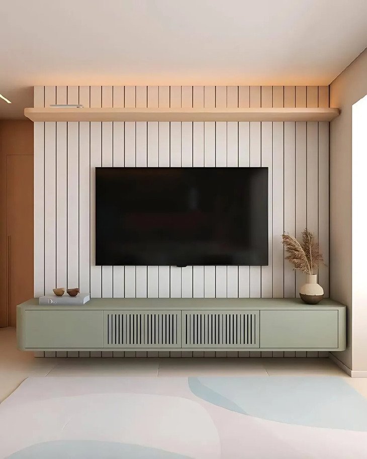 The placement of the TV is almost like a calm anchor in the space. I love how the wall lines enhance the TV, making it feel integrated rather than just stuck on the wall. The soft lighting above the TV adds a gentle warmth, creating an inviting atmosphere. It’s the kind of design where every detail feels intentional, yet there’s this wonderful sense of ease.