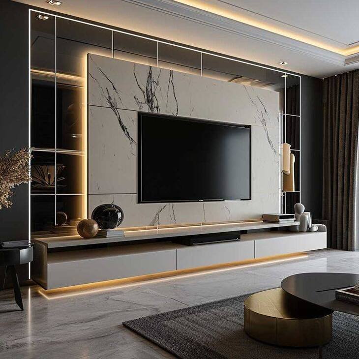 If you're a fan of bold, dramatic looks, the second design is a game-changer. Think dark, almost charcoal-colored walls paired with rich marble accents. The TV is set against this striking backdrop, with an illuminated marble slab beneath it, creating an elevated vibe. The dark tones, accented with soft gold or brass lighting, give the space a luxurious feel, making it perfect for those who enjoy a moody, refined atmosphere.
