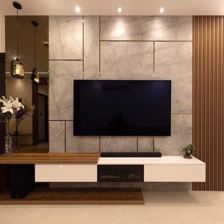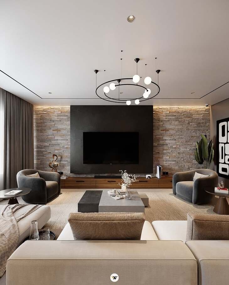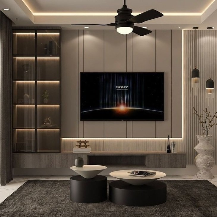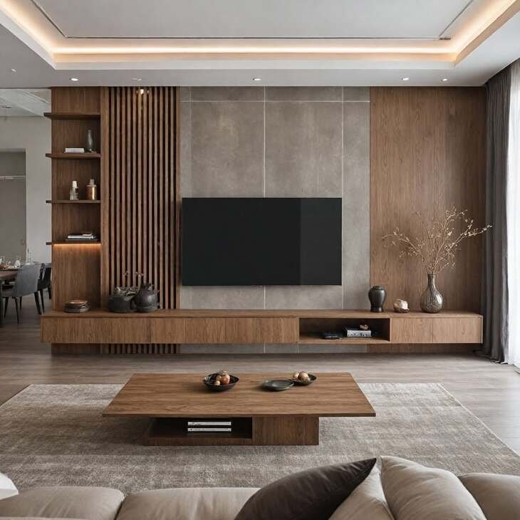 For those who appreciate the blend of modern and industrial, this design combines raw materials like steel and concrete with sleek, minimalist furniture. The TV wall is simple, featuring a large concrete panel or raw steel surface behind the TV. It’s a bold, edgy choice that screams modern luxury, yet still feels down-to-earth. The floating shelves are perfect for showcasing artwork or sculptural pieces, and the industrial lighting adds to the atmosphere without overpowering the overall design.