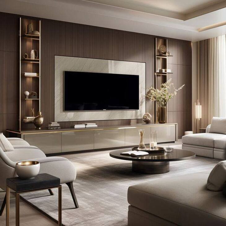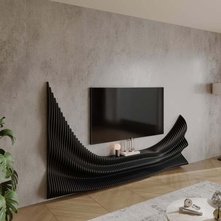 For a true statement piece, modern sculptural elements are an excellent choice. One design I’ve recently seen pairs a minimalist TV setup with striking, sculptural elements on the wall—think clean lines and a few abstract shapes in rich, luxurious materials. The contrast between the minimalist TV and the artistic sculpture surrounding it creates a gallery-like atmosphere.