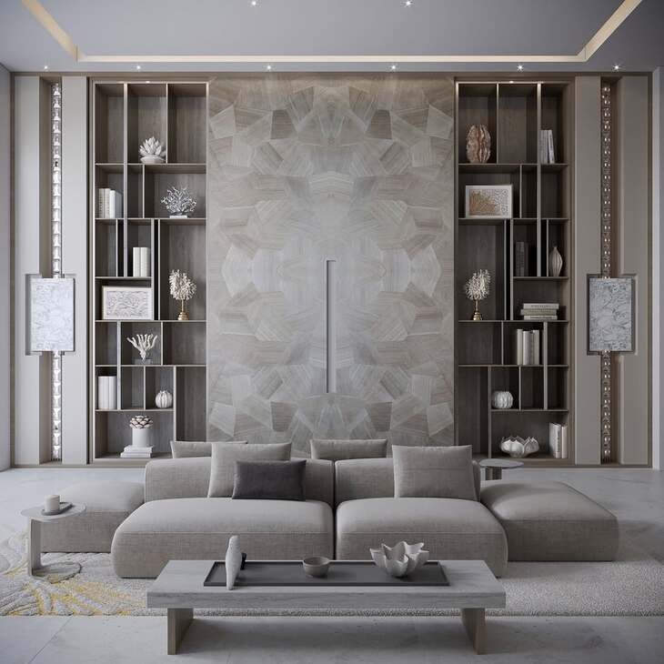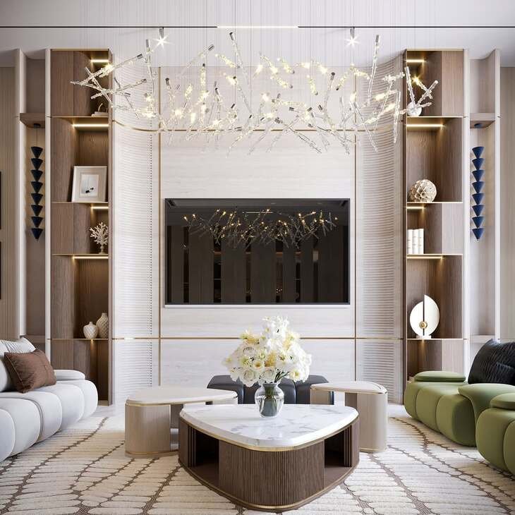 Choose creamy neutrals, soft lighting, and subtle curves if you want to recreate this. It’s modern luxury but with an artistic twist.