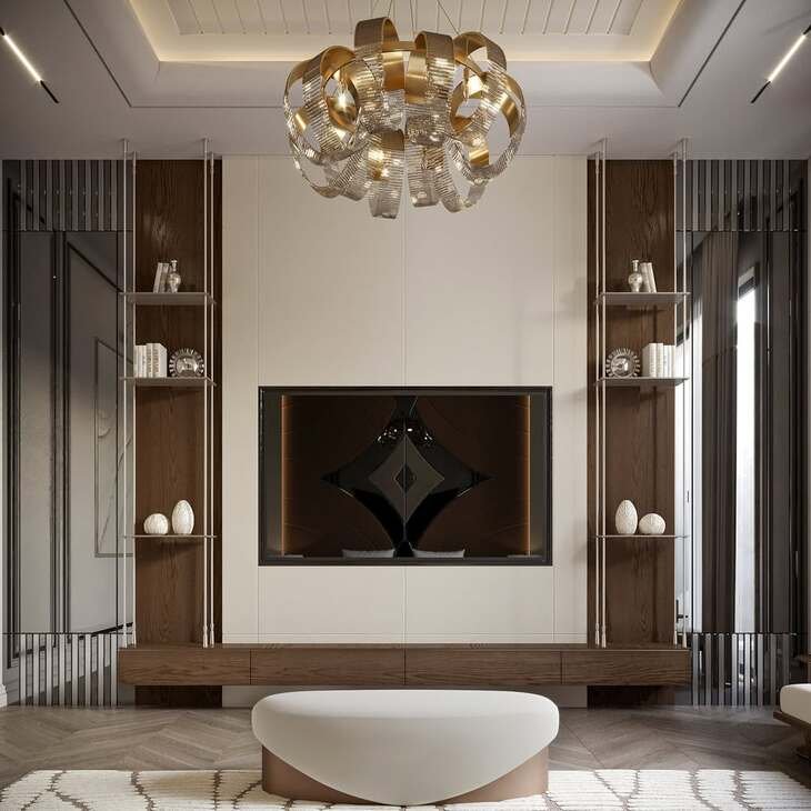 I have to admit, I wasn’t sure how industrial elements would fit with luxury living room decor. But then I saw this design, and everything changed. The exposed brick wall around the TV gives this living room an edge, while the sleek, polished finishes on the furniture and wall features balance out the roughness of the brick. It’s an unlikely pairing that works incredibly well.