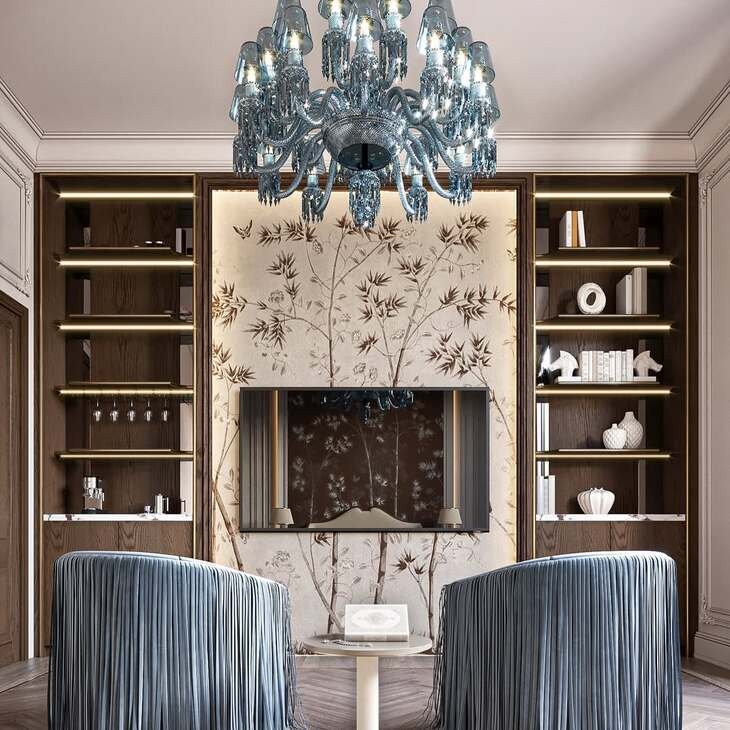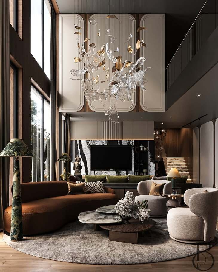 The first design features a luxurious living room with a breathtaking chandelier that steals the show. Hanging gracefully from the ceiling, the chandelier appears almost like floating crystals, catching the light and adding an ethereal quality to the room. This piece not only enhances the modern luxury aesthetic but also creates a focal point that draws the eye upward, making the space feel grand and expansive.