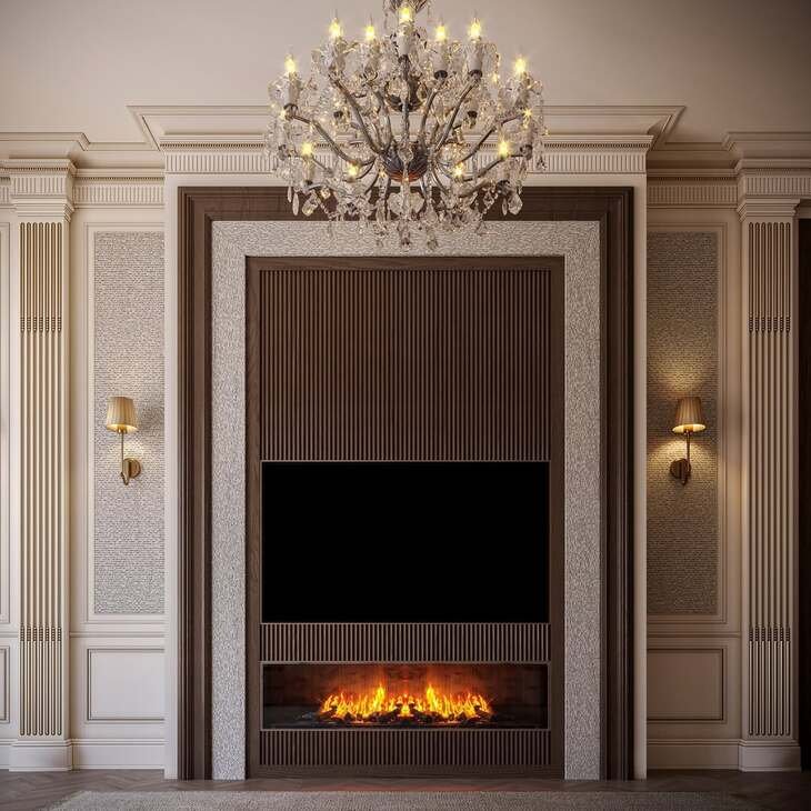 If you're looking to make a statement, bold lighting fixtures and vibrant colors can completely change the vibe of your living room. Picture this: a stunning chandelier hanging above the TV, casting a soft glow on the walls and furniture. This design is all about making your TV wall decor a bold, vibrant statement without overwhelming the space.