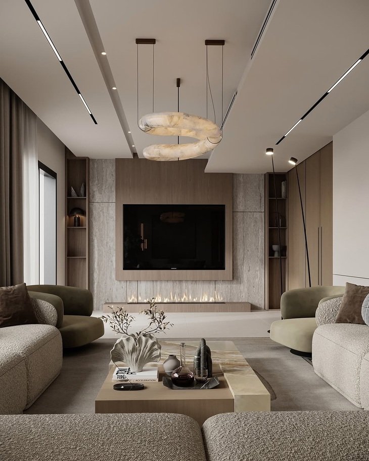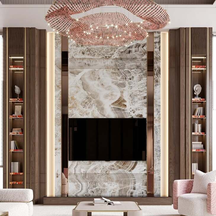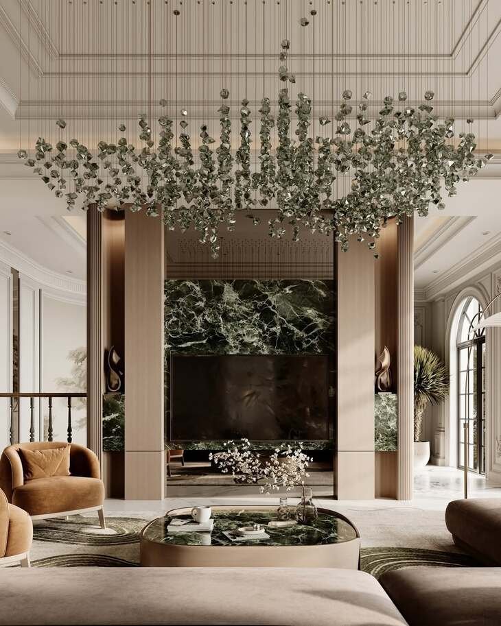 The TV wall itself is surrounded by rich green marble, which is both luxurious and timeless. Marble, with its intricate veining and polished finish, creates a visually stunning backdrop for the television, transforming the TV area into the centerpiece of the room. The combination of marble and the statement chandelier evokes a sense of opulence, while the beige-toned furniture, such as the plush armchairs and coffee table, offers a calming contrast. The furniture complements the luxurious elements of the room without overwhelming the design, ensuring that the space feels balanced and inviting.