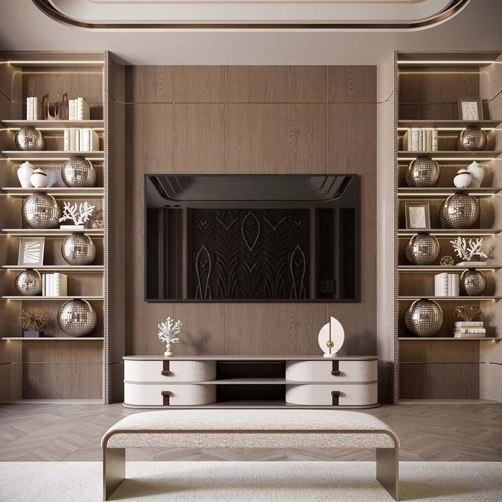 The beauty of this design lies in the simplicity. The built-in shelves on the sides of the TV add functionality without overpowering the aesthetic. Soft lighting is added above the shelves, illuminating small decorative pieces like vases or sculptures. This creates a cozy, inviting atmosphere without cluttering the space. The furniture around it, such as low-profile sofas and a simple coffee table, complements the look, keeping the entire space balanced and open.