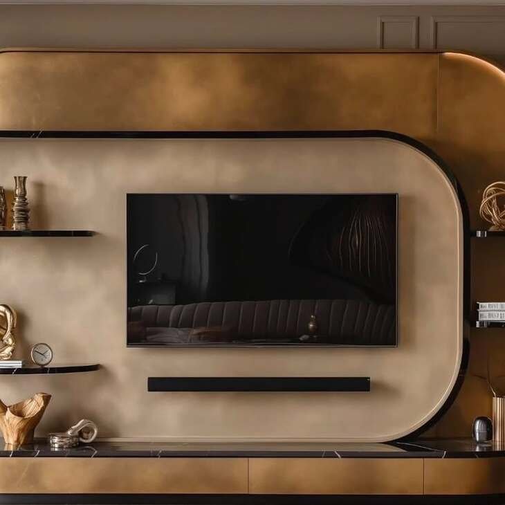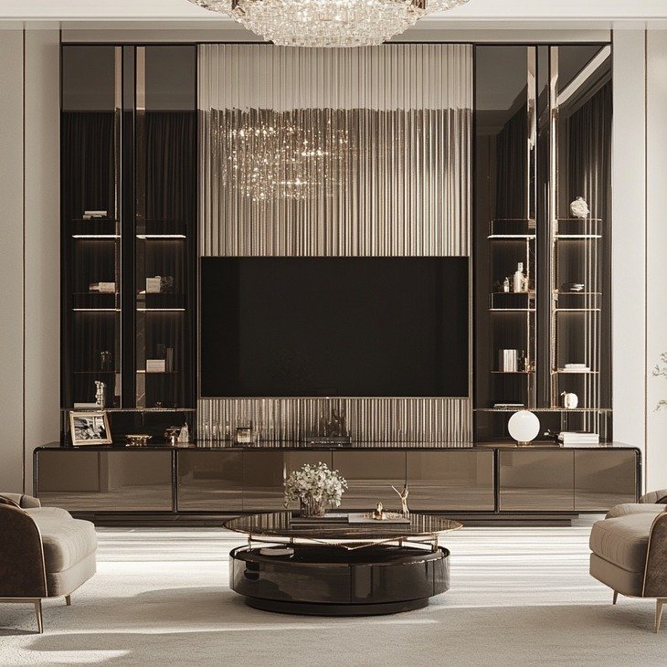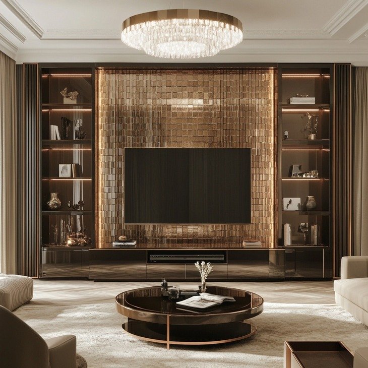 Imagine walking into a room and being met with shiny surfaces, soft lighting, and sleek modern designs. That’s exactly what this TV wall concept offers—a glossy finish combined with high-end materials and gold accents. The TV itself is framed by rich textures and dark tones, while the rest of the room features elegant pieces like gold-trimmed vases and sleek furniture.
