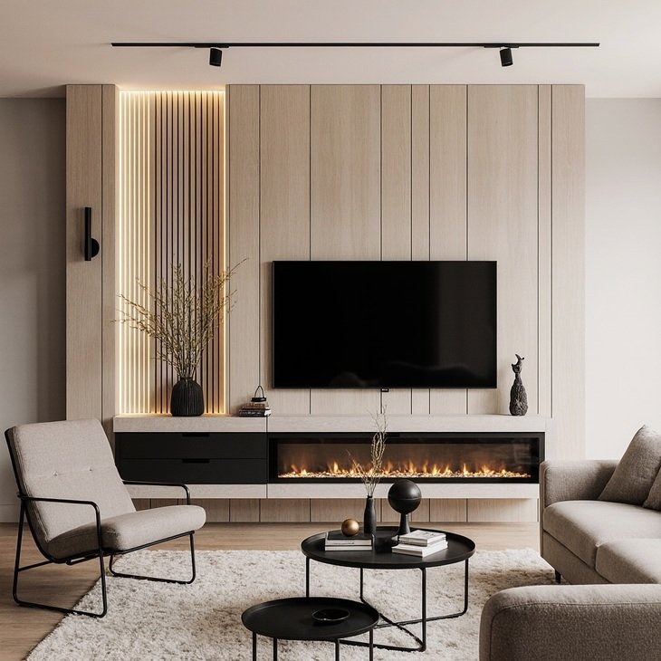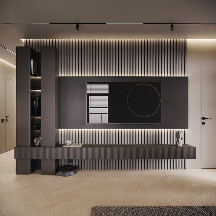 If you want this style, stick with matte finishes, neutral colors, and panels or slats placed intentionally rather than symmetrically. The lighting does the rest of the work.
