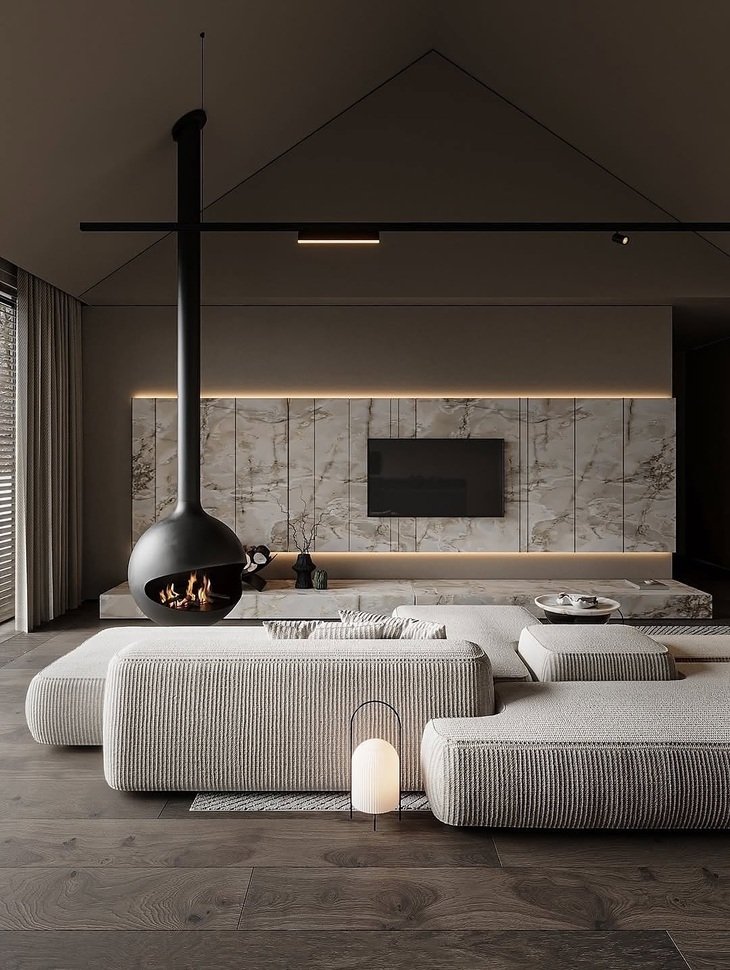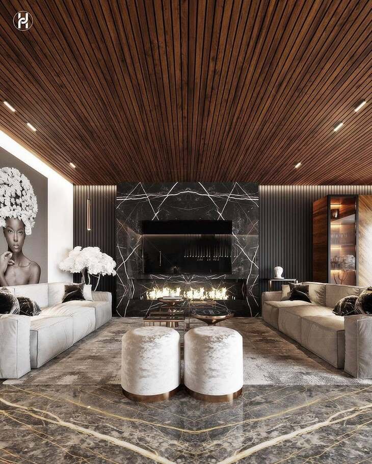 If I had to choose a second favorite, this would definitely be it. The combination of marble and wood creates an instant “wow” factor. The bold black marble TV wall paired with the warm wood ceiling gives this living room a bold yet comforting feel. And can we talk about the cozy fire pit at the center? Not only does it keep the space warm, but it also elevates the overall luxury feel. Plus, it's practical, which I love in design—who says style can’t also be functional?