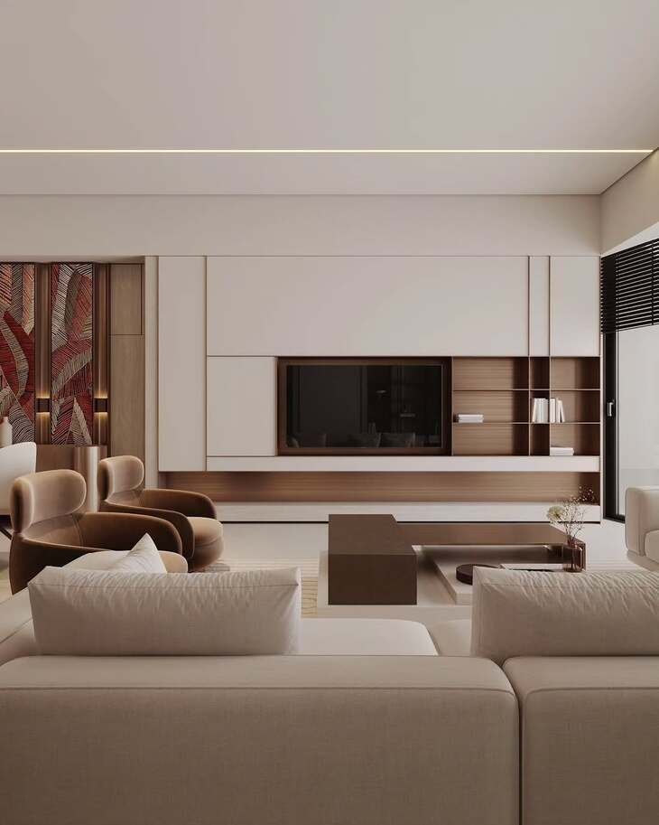 The warm neutral tones used for the cabinetry and walls add a soft touch to the sleek design. I can just imagine how relaxing it would be to unwind in this living room with everything looking so put together yet effortlessly stylish. The addition of a few small plants brings some greenery into the space, which I personally think is the perfect touch. If you're aiming for a clean, sophisticated look, this design screams [TV wall decor living room modern luxury].