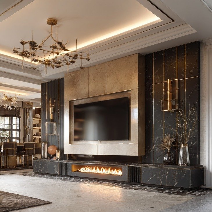 If you love bold statements, this TV wall design with gold accents and black marble might just steal your heart. The dark tones of the TV wall, paired with gold, create a luxurious yet dramatic atmosphere that demands attention. The piece de resistance here? The incredible chandelier above. It’s almost as if it’s the star of the show, and the TV wall is just there to enhance it.