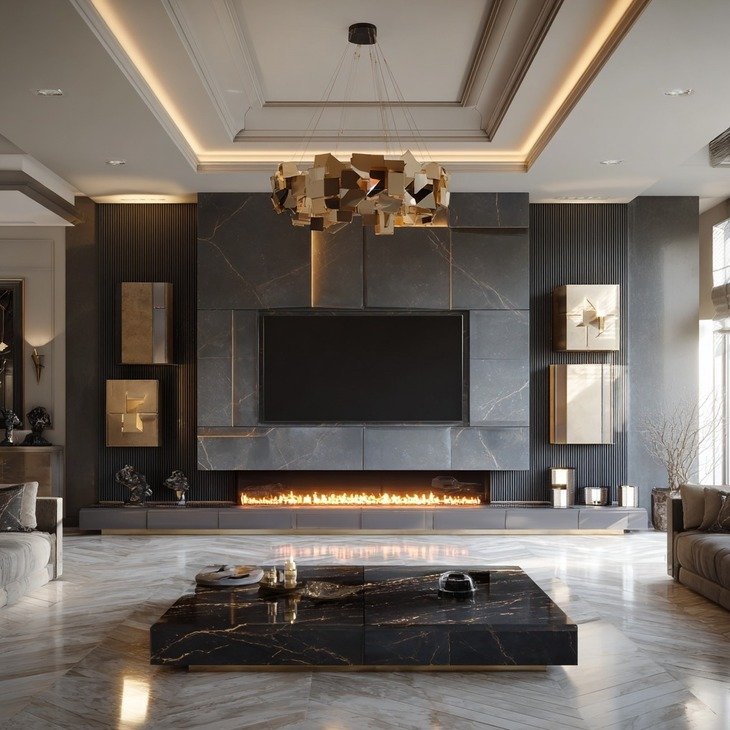 Now, if you really want to turn your TV wall into a statement piece, marble is your best friend. Think dark gray marble with sleek gold accents surrounding your TV, as in this stunning design. The glossy texture and subtle veining of the marble make the TV seem like it’s floating in the air. It’s a dramatic and opulent approach that makes your living room feel like a luxury hotel lounge.