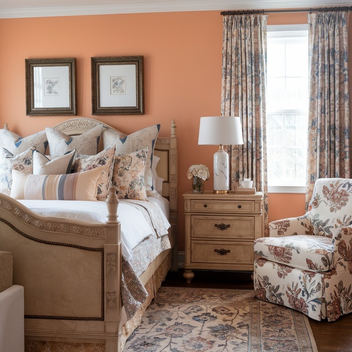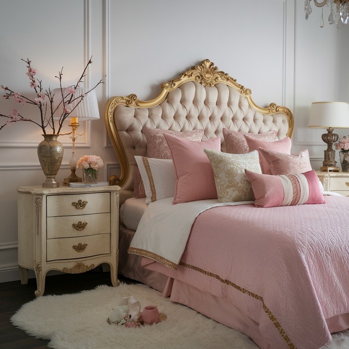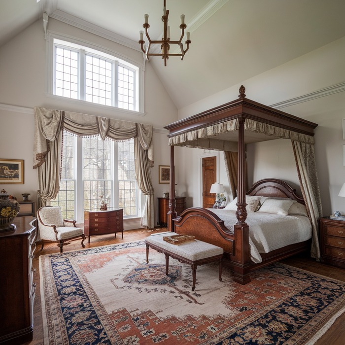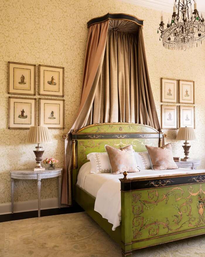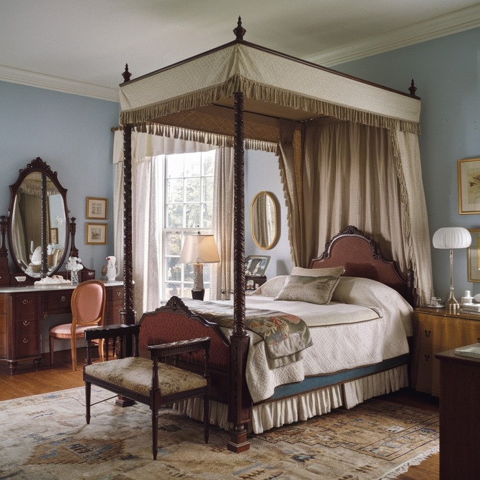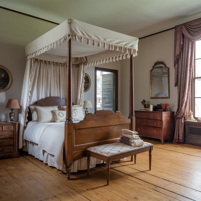A four poster or corona canopy sets the whole mood. If your ceilings are tall, go big with carved posts and a fringed valance. Lower ceilings, try a slimmer poster or a wall mounted canopy crown. I like drapery that puddles just a little, about an inch, so it feels rich but not messy. Use two fabrics, a lining and a pretty face fabric, so the folds look plump.